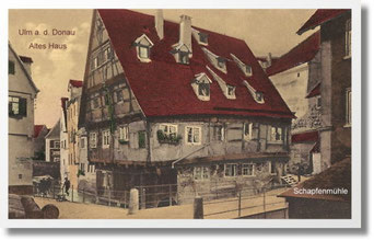 Die Schapfenmühle stand gegenüber dem "Schiefen Haus". Sie fiel einem Brand am Pfingstsonntag 1983 zum Opfer. Links daneben am Weinhofberg 19, wohnten die Großeltern von Albert Einstein. Heute befindet sich das Einstein Museum in diesem Gebäude.